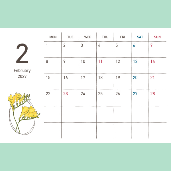 カレンダー|2027年2月|フリー素材 はがきカレンダー 2025.12.08 はがきカレンダー はがきサイズ スポンサーリンク 2027年2月のカレンダーのテンプレートです。2月のカレンダーの植物は、「フリージア」です。 サイズははがきサイズ(横)です。書き込みもしやすい、シンプルなデザインです。フリー(無料)でダウンロードできます。 calendar|2027. February カレンダー|2027年2月|フリージア