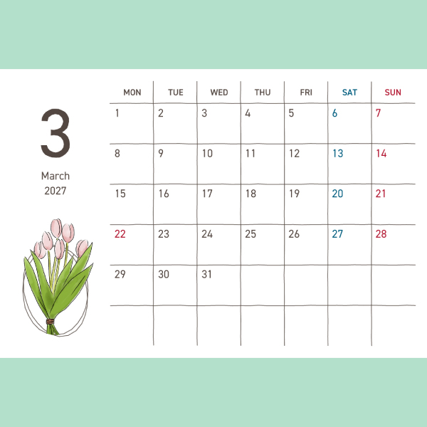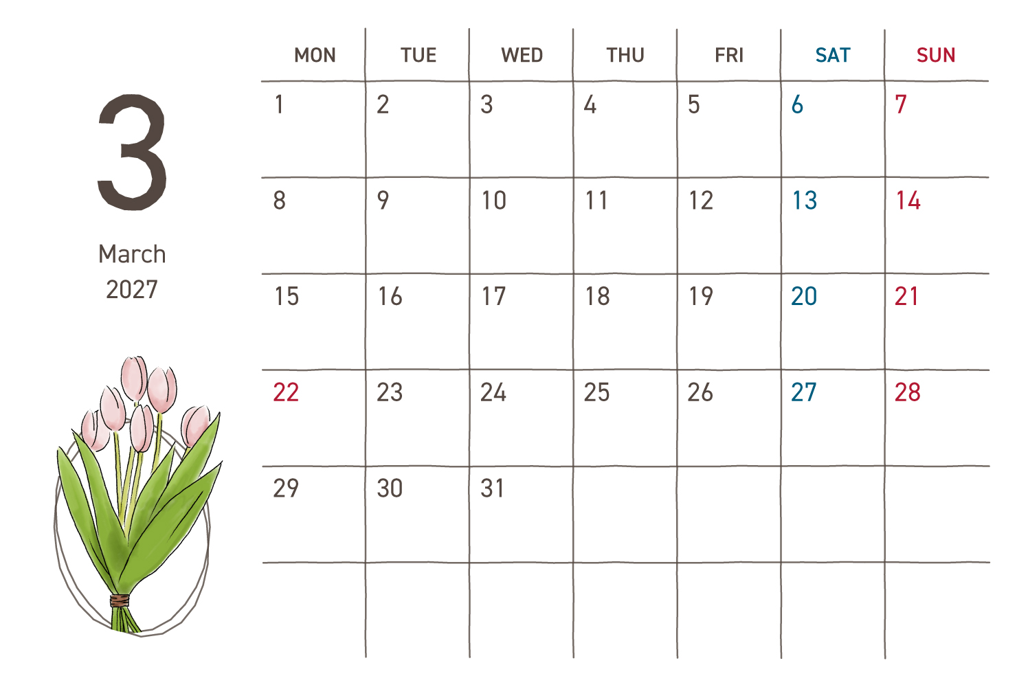 カレンダー|2027年3月|フリー素材 はがきカレンダー 2025.12.08 はがきカレンダー はがきサイズ スポンサーリンク 2027年3月のカレンダーのテンプレートです。3月のカレンダーの植物は、「チューリップ」です。 サイズははがきサイズ(横)です。書き込みもしやすい、シンプルなデザインです。フリー(無料)でダウンロードできます。 calendar|2027. March カレンダー|2027年3月|チューリップ