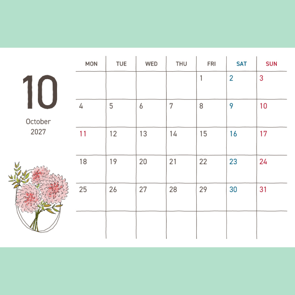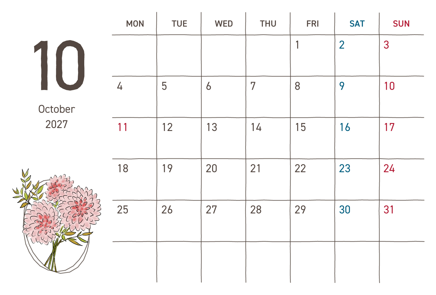 カレンダー|2027年10月|フリー素材 はがきカレンダー 2025.12.08 はがきカレンダー はがきサイズ スポンサーリンク 2027年10月のカレンダーのテンプレートです。10月のカレンダーの植物は、「ダリア」です。 サイズははがきサイズ(横)です。書き込みもしやすい、シンプルなデザインです。フリー(無料)でダウンロードできます。 calendar|2027. October カレンダー|2027年10月|ダリア
