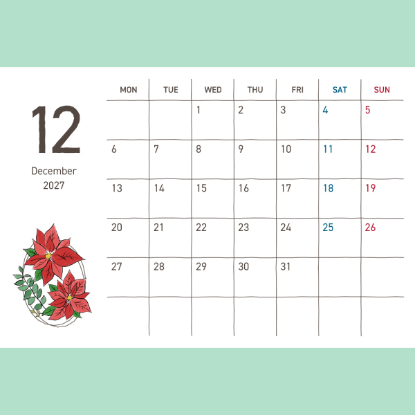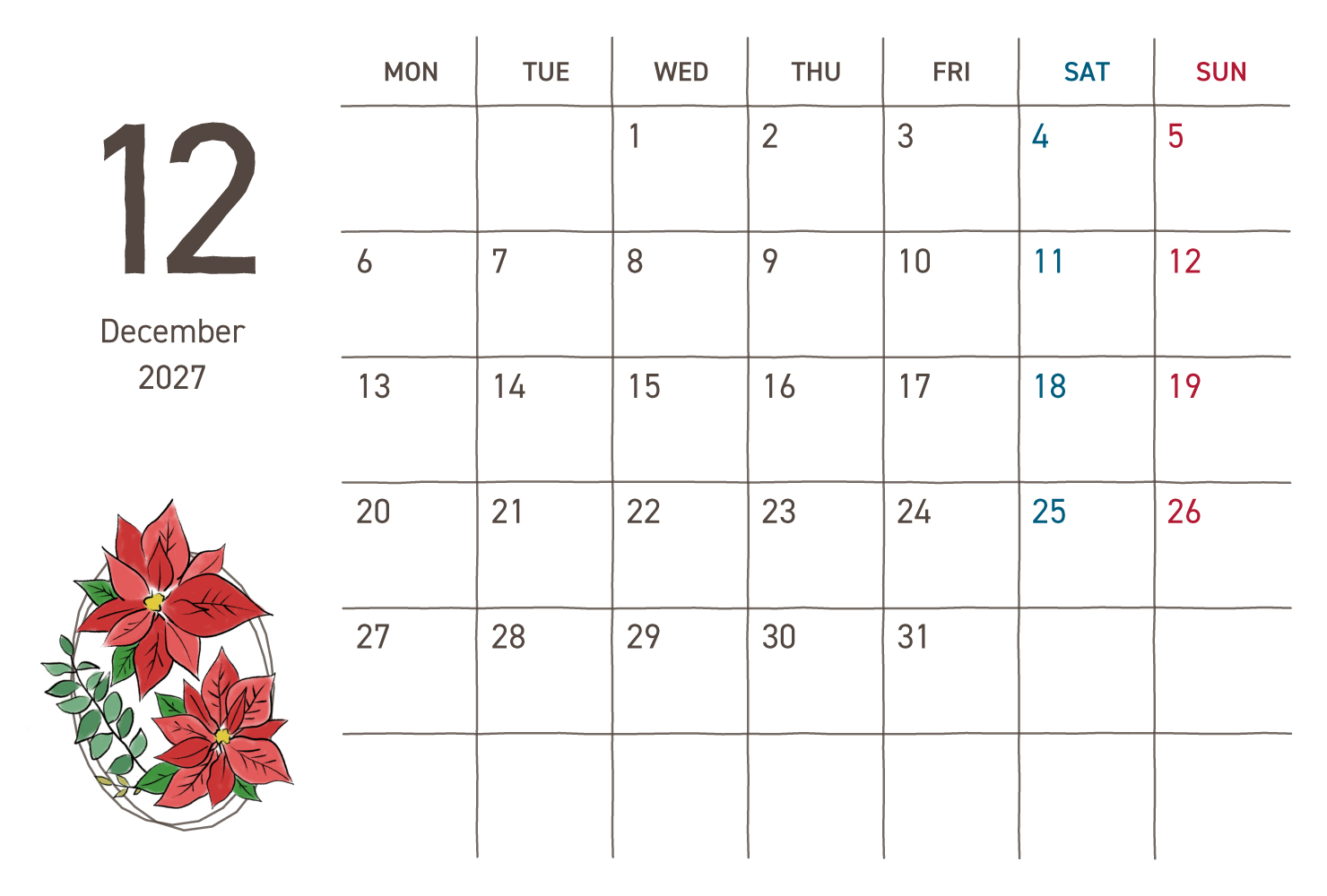 カレンダー|2027年12月|フリー素材 はがきカレンダー 2025.12.08 はがきカレンダー はがきサイズ スポンサーリンク 2027年12月のカレンダーのテンプレートです。12月のカレンダーの植物は、「ポインセチア」です。 サイズははがきサイズ(横)です。書き込みもしやすい、シンプルなデザインです。フリー(無料)でダウンロードできます。 calendar|2027. December カレンダー|2027年12月|ポインセチア