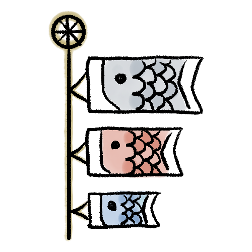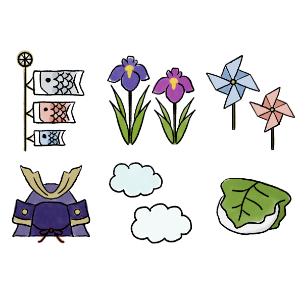 こどもの日のイラストです。こいのぼり(鯉幟)・ハナショウブ(花菖蒲)・かざぐるま(風車)・かぶと(兜)・くも(雲)・かしわもち(柏餅)です。フリー(無料)でダウンロードできます。