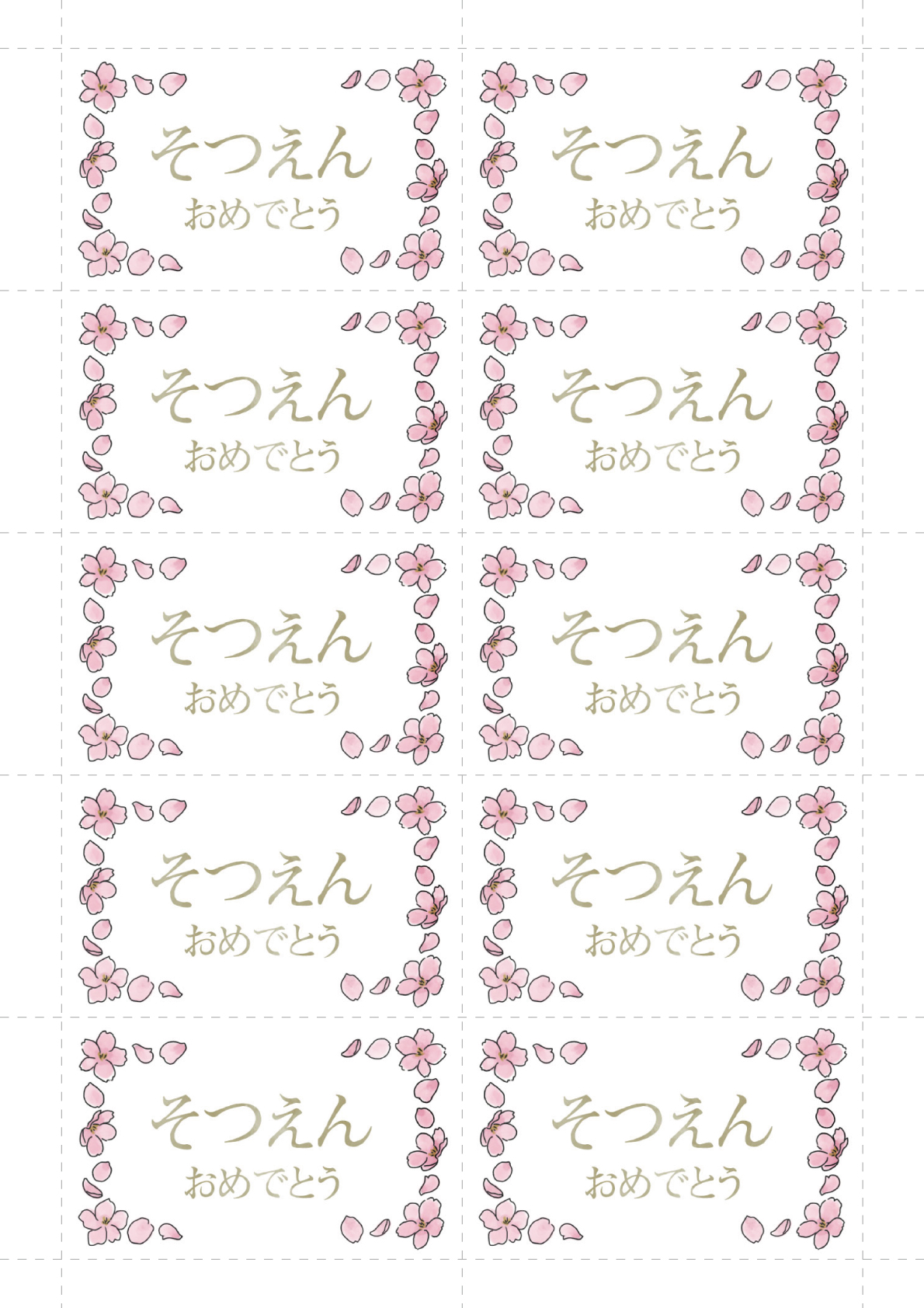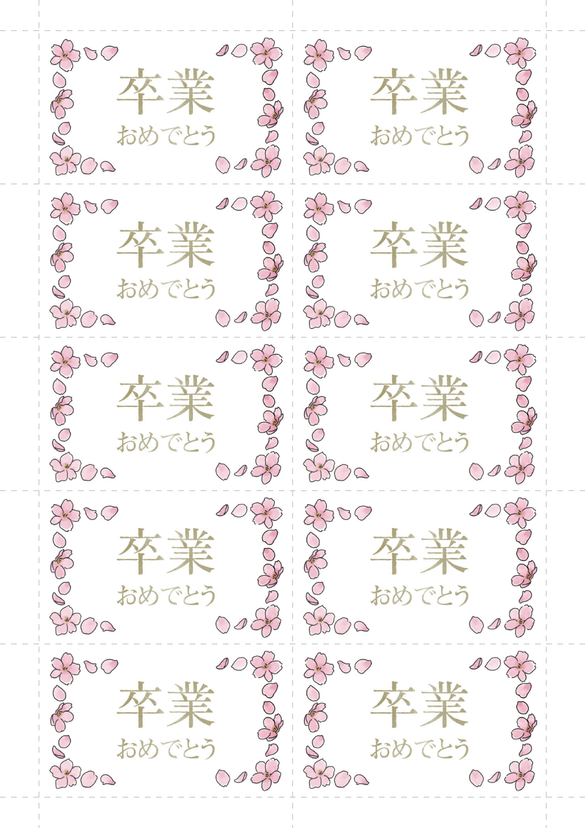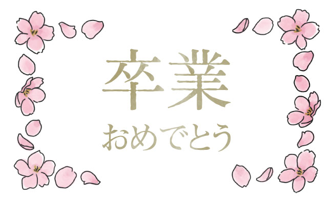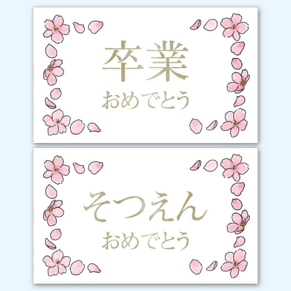 桜の花のイラストをあしらったデザインのメッセージカードです。卒業・卒園(そつえん)お祝いのメッセージや、ギフトにそえて。デザインは (1)卒業おめでとう・(2)そつえんおめでとうの2点からお選びいただけます。