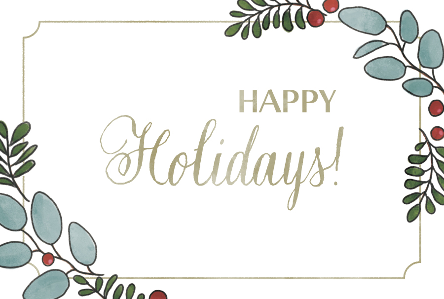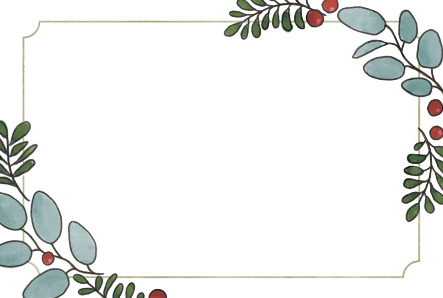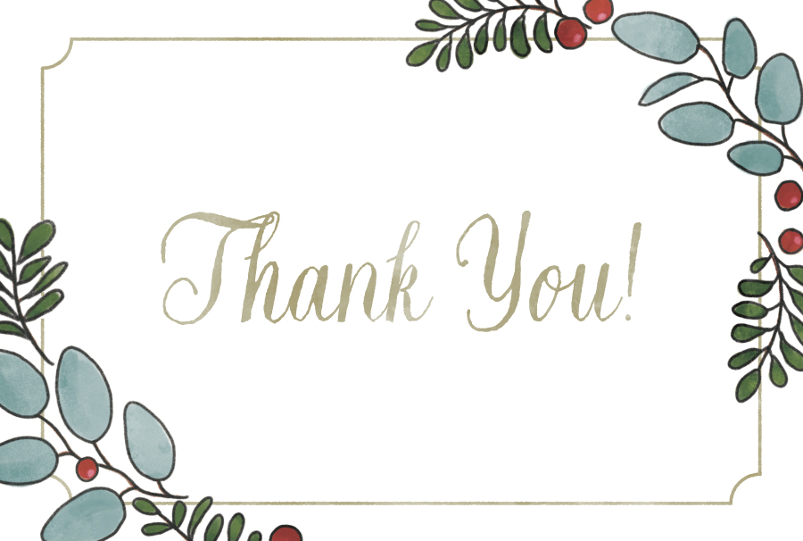 ユーカリの葉とヤドリギの赤い実のイラストをあしらった、メッセージカードのテンプレートです。クリスマスカードに。HAPPY Holidays! と Thank You! の文字入りもお選びいただけます。裏面の罫線もご利用ください。はがきサイズです。