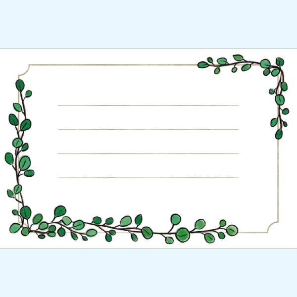 メッセージカードのテンプレート|ワイヤープランツ|03 メッセージカード 2026.01.30 メッセージカード ウェディングはがきサイズ緑色 スポンサーリンク ワイヤープランツをあしらった、メッセージカードのテンプレートです。ウェディングやバースデーに。罫線あり・罫線なし タイプをお選びいただけます。はがきサイズです。 素材はフリー(無料)でダウンロードしてお使いいただけます。イラストを右クリックして「名前を付けて画像を保存」から画像を保存してお使い下さい。 メッセージカードのテンプレート|ワイヤープランツ|03|罫線あり メッセージカードのテンプレート|ワイヤープランツ|03|罫線なし プリントアウトでお困りの方は、greenstock40’s STOREでカンタン高品質印刷! ※価格例:はがきサイズ 300部→1枚あたり約10.3円! ▶ はがきサイズはこちらから