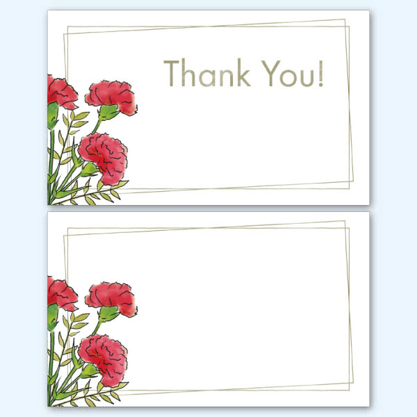 メッセージカード赤色のカーネーションのイラストをあしらった、サンキューカードのテンプレートです。母の日はもちろん、 ギフトのメッセージカードやショップカードに。「Thank You!」の文字入り・なしお選びいただけます。